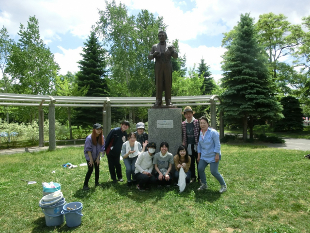 6月2日(日)、「札幌彫刻美術館友の会」による中島公園の屋外彫刻清掃活動に、文化総合学科学生有志6名と教員1名が参加しました。「札幌彫刻美術館友の会」の皆さんは、屋外彫刻の清掃やデータベース作りを通じて、作品に広く親しんでもらうためのボランティア活動を行っています。