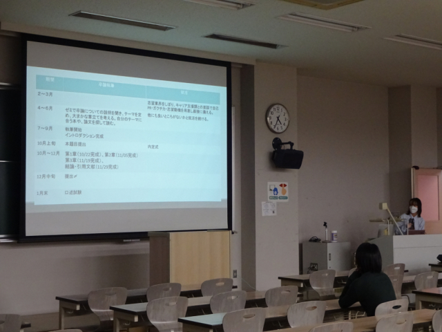 2月6日(月)に、英語文化学科3年生を主に対象とした「卒業論文発表会」を行いました。ここ数年新型コロナウイルス感染症の影響を受け、オンラインでの開催となっておりましたが、今回は久しぶりの対面での開催となり、今年度卒業論文を提出した4年生4名が、卒業論文の内容や執筆のスケジュール、就職活動との両立の仕方などについて丁寧にお話してくれました。