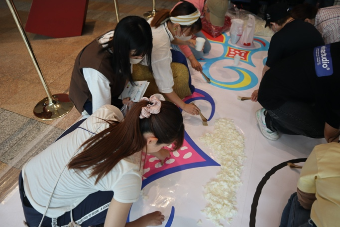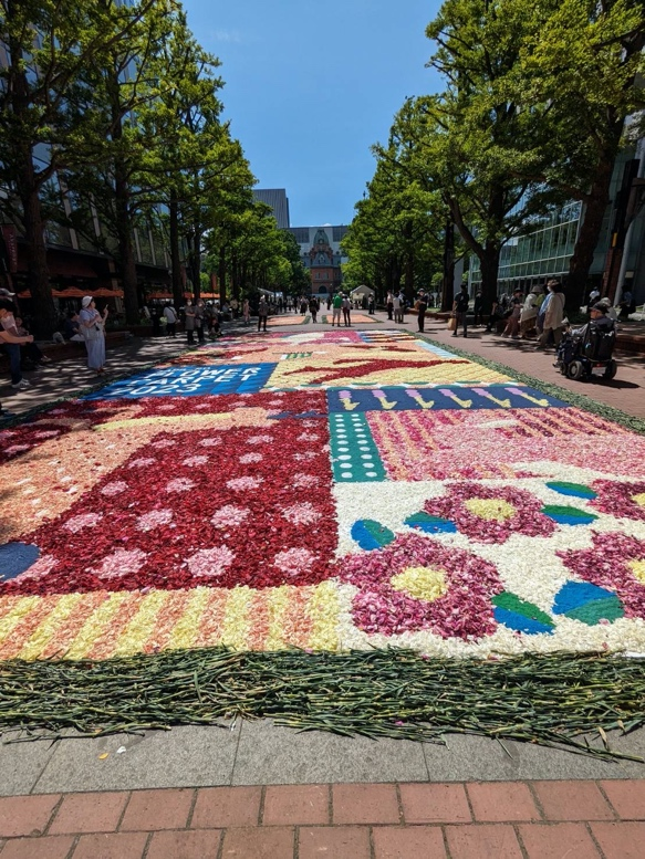 今年で9回目になるフラワーカーペットは、花びらや自然素材を用いて、まちのなかに大きな絵を作り上ける市民参加型のアートイベントです。今年は市内5カ所で実施され、私たちは「札幌市北3条広場(アカプラ)」「JRタワー1階東コンコース」の2か所の活動に参加しました。学生からは「先輩や地域の人々との交流を楽しみながらも社会に溶け込む貴重な体験ができ、非常に楽しい作業となった」「活気ある街づくりだなと感じました。通りすがる人も足を止めて何を作っているのか気になっていたり、仲間で一緒に作り上げていくのが楽しかった」「人と関わることが苦手だったため、活動中に知らない人と会話できていたことに驚きがあった。人と関わることも今では一種のまちづくりになっているのだと実感した」「コロナが5類に移行し、街が再び多くの人で賑わうようになってきたこのタイミングで、このような人々の心を温かくする華やかな企画を特に人通りの多いエリアを中心に行うことは、まちの治安維持に繋がると感じた」などのような声が聞かれました。