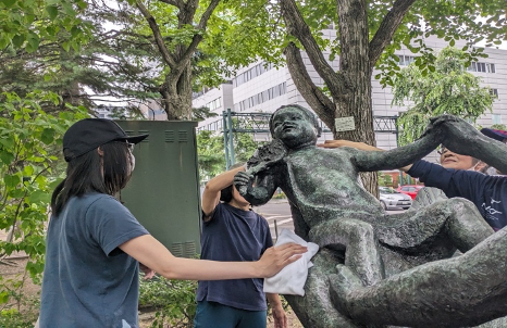 7月7日(日)に、文化総合学科の学生9名、教員1名、サポートスタッフ1名の計11名で大通公園の彫刻清掃ボランティア活動に参加しました。主催は札幌彫刻美術館友の会で、昨年同様、札幌大通公園ロータリークラブの皆さんと共同での参加です。