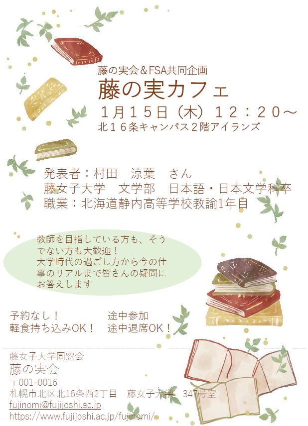 FSA(Fuji Student Assistant)と同窓会(藤の実会)の共同企画である「藤の実カフェ」を、1月15日(木)のお昼休み時間に北16条キャンパスのi.Learning Space(アイランズ)にて開催しました。