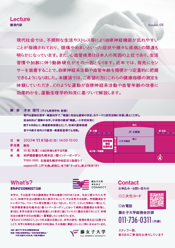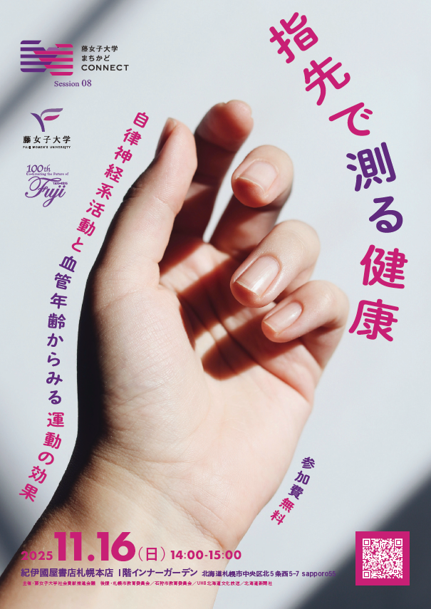 現代社会では、不規則な生活やストレス等により自律神経機能が乱れやすいことが指摘されており、頭痛やめまいといった症状や様々な疾病との関連も明らかになっています。また、心血管疾患は日本人の死因の上位であり、生活習慣や加齢に伴う動脈硬化がその一因となります。近年では、指先にセンサーを装着することで、自律神経系活動や血管年齢を簡便かつ定量的に把握できるようになりました。本講演では、ご希望の方にこれらの健康指標の測定を体験していただき、どのような運動が自律神経系活動や血管年齢の改善に効果的かを、運動生理学的知見に基づいて解説します。